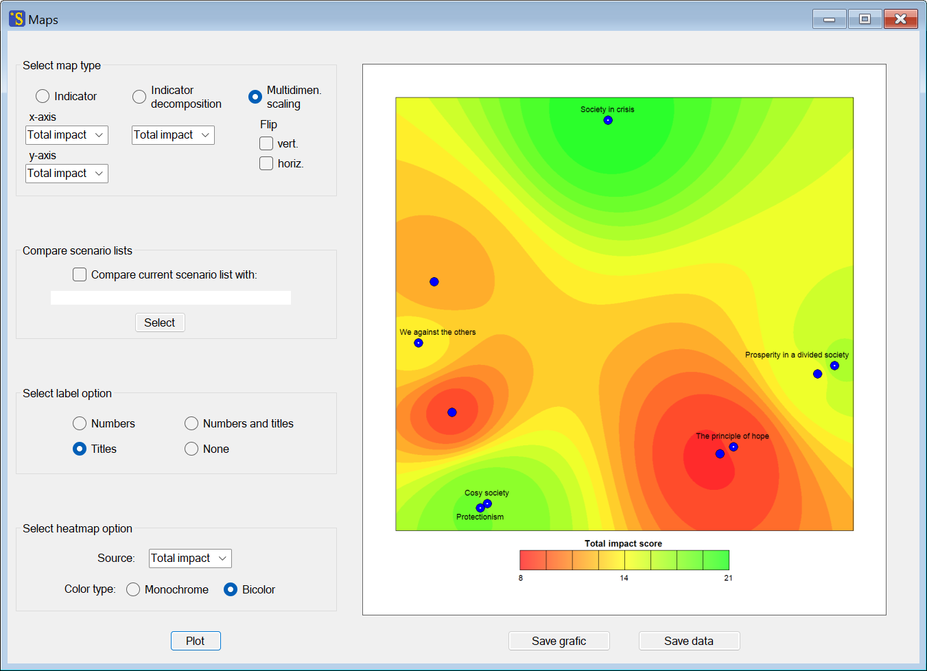 5. Beyond the individual scenarios, the future landscape of the system under study can also be visualized as a whole, for example using a so-called MDS plot, in which the scenarios are arranged according to their mutual similarities and dissimilarities, and the stable and unstable domains of the future landscape are indicated by different colors.